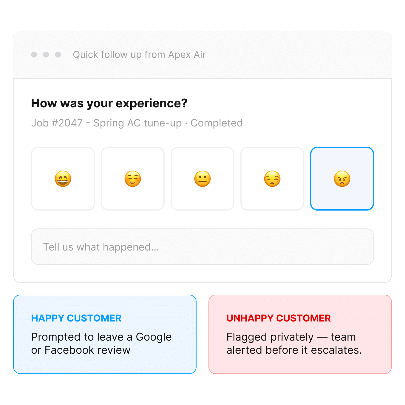 Many HVAC companies don’t find out a customer is unhappy until they cancel a maintenance agreement, they request a refund, or they leave a bad review. Chatavise surveys surface issues earlier.